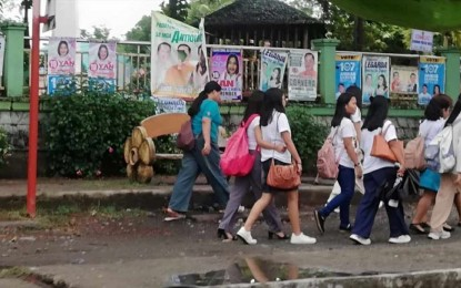 Students pass through a common campaign poster area at the Sibalom Municipal Plaza on March 27, 2025. Commission on Elections Deputy Executive Director for Operations Rafael Olaño on Thursday (March 27, 2025) once again called on local candidates to remove their illegal campaign posters as they could be used as evidence for the filing of an election offense. (PNA photo by Annabel Consuelo J. Petinglay)