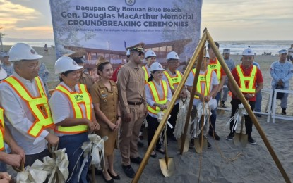 Senator Grace Poe, Dagupan City Mayor Belen Fernandez (second from left), and other officials lead the groundbreaking ceremony for the Gen. Douglas MacArthur Memorial Building in Bonuan Blue Beach on Monday (Feb. 24, 2025). The project seeks to honor the heroism of World War II veterans, including MacArthur and his troops, who played major roles in the country’s liberation from Japanese invaders. (PNA photo by Hilda Austria)