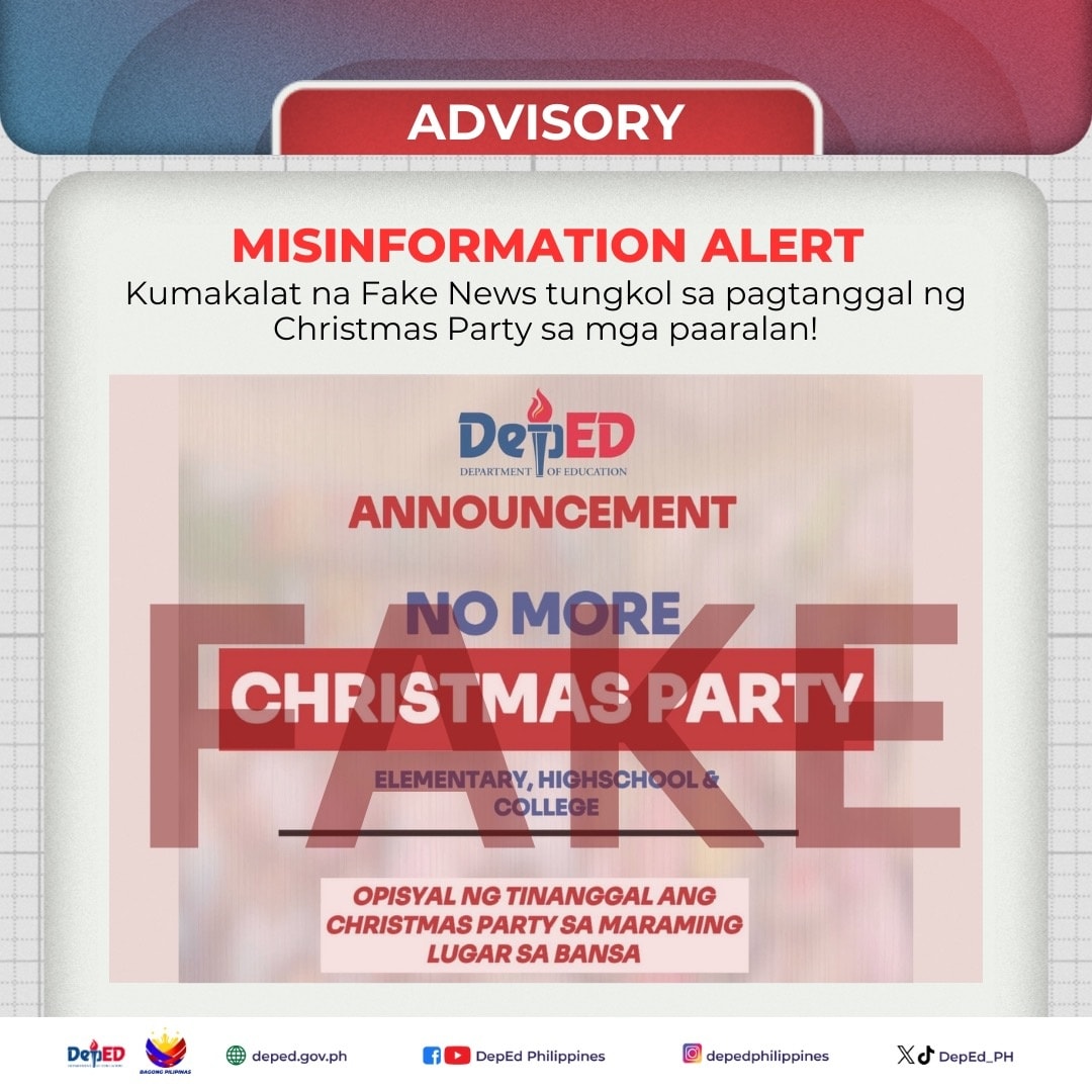 The Department of Education on Monday warned the public against fake social media posts alleging that Christmas parties in schools have been canceled nationwide.