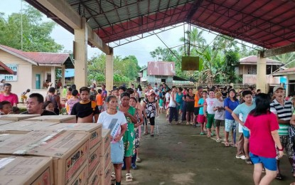 The distribution of family food packs from the Department of Social Welfare and Development (DSWD) in Arteche, Eastern Samar in this Feb. 15, 2025 photo. The DSWD has distributed 6,397 family food packs to families badly affected by flooding caused by a shear line in Eastern Samar province last week. (Photo courtesy of DSWD Eastern Visayas)