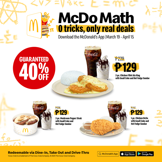 With McDo Math, 40 percent off is really 40 percent off, guaranteed. McDonald’s App offers 40-percent off on its rice meals inclusive of a drink and Hot Fudge Sundae. For P129, choose from a two-piece Chicken Fillet Ala King, two-piece Mushroom Pepper Steak or a one-piece Chicken McDo with a small Coke and Hot Fudge Sundae.