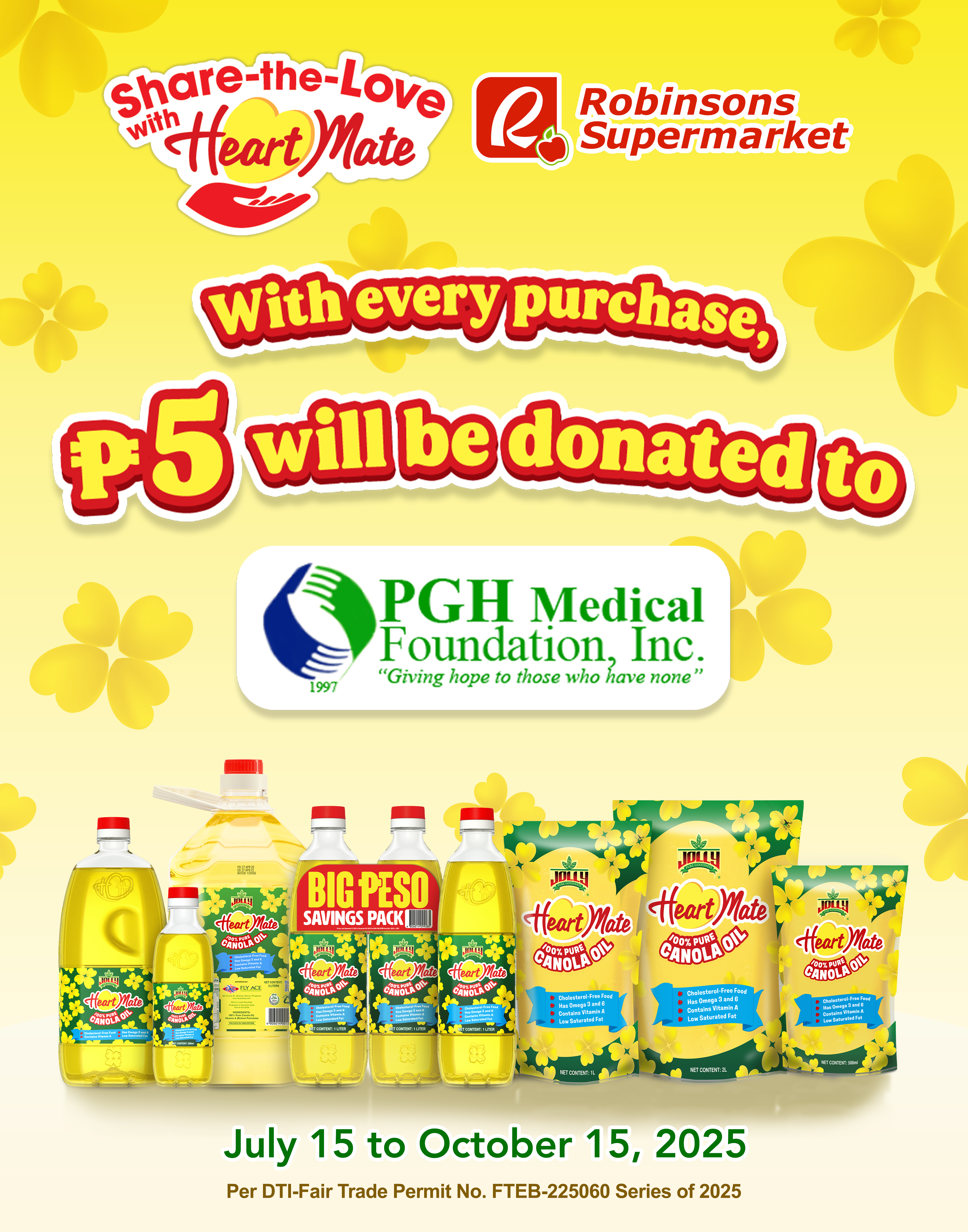 From July 15 to October 15, 2025, every Heart Mate Canola Oil product you buy at Robinsons Supermarket stores nationwide will trigger a ₱5 donation to the Philippine General Hospital Medical Foundation, Inc. (PGHMFI) — funding critical treatments, equipment, and care for underprivileged patients who rely on PGH for life-saving support.