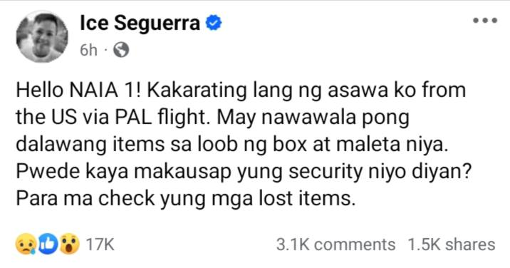 Seguerra took to Facebook to report the incident, tagging NAIA authorities and urging them to assist in locating the lost items. His post has gained significant online traction, accumulating over 3,000 comments and nearly 2,000 shares as netizens rallied behind the couple.
