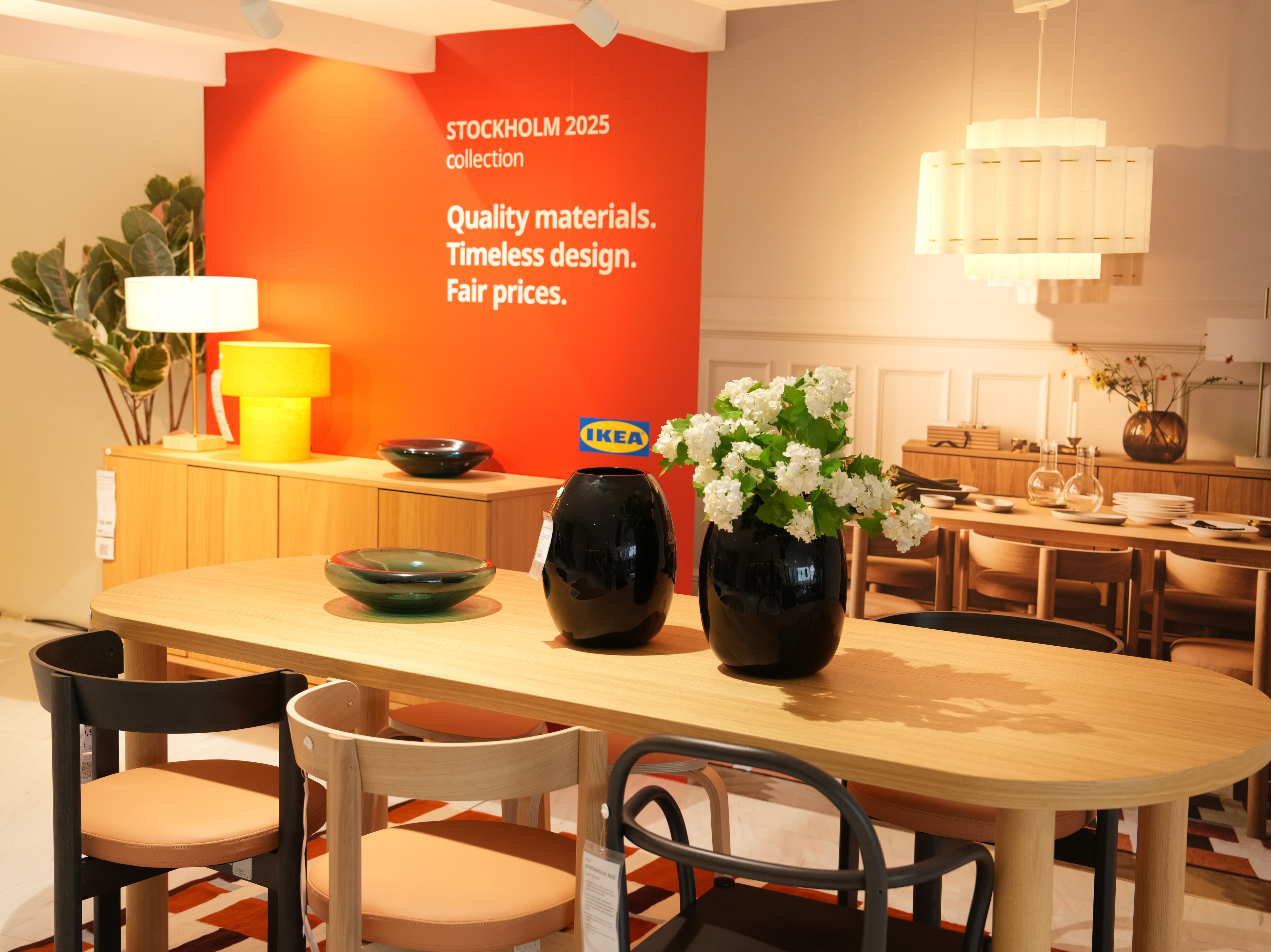 An IKEA STOCKHOLM 2025 dining room decorated with wooden tables and chairs, and mouth-blown glass vases to bring an inviting vibe.