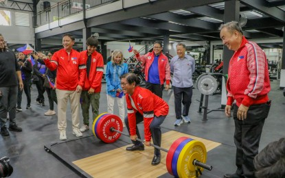 President Ferdinand R. Marcos Jr. playfully attempts to lift weights at the newly refurbished PhilSports Complex gym in Pasig City on Wednesday (Nov. 19, 2025). Also in photo are (1st to 3rd from left) Philippine Sports Commission Chairperson Patrick Gregorio, presidential son Vinny Marcos and Gymnastics Association of the Philippines president Cynthia Carrion, with Philippine Olympic Committee president Abraham Tolentino (right). (PSC photo)