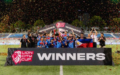 Members of the Philippines U16 team celebrate after winning the 29th Lion City Cup in Singapore on July 13, 2025. The National Capital Region Football Association Center of Excellence (NCRFA-COE) formed the team, which won the title for the first time. (Contributed photo)