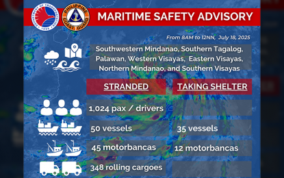 A maritime safety advisory issued by the Philippine Coast Guard (PCG) is effective from 8 a.m. to 12 p.m. on Friday (July 18, 2025). The PCG said more than 1,000 individuals are so far stranded in ports nationwide due to inclement weather brought by Tropical Storm Crising. (Photo courtesy of PCG)