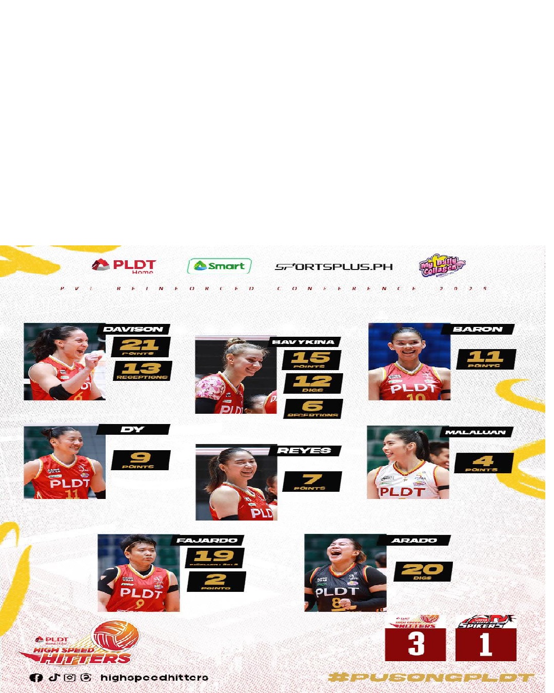 Import Anastasiia Bavykina backed her up with 15 points and strong floor defense, while middle blocker Majoy Baron delivered 11 points anchored on five kill blocks—helping PLDT control the net in the clutch.