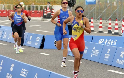 Filipino Kim Mangrobang (front) competes in the run leg of the duathlon mixed team relay event of the World Games in Chengdu, China on Sunday (Aug. 17, 2025). Mangrobang and Franklin Lee finished 11th. (Contributed photo)