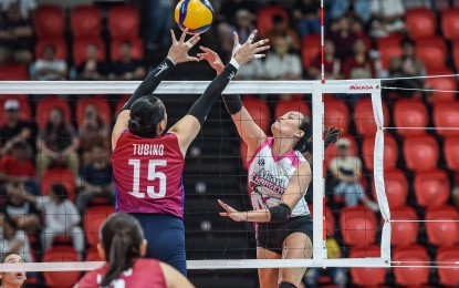 Ced Domingo of Akari (right) goes against Royse Tubino of Choco Mucho in the PVL All-Filipino Conference at the Philsports Arena in Pasig City on April 12, 2025. The Premier Volleyball League will hold a two-month Tour in various provinces starting in Vigan, Ilocos Sur on June 22, 2025. (PVL photo)